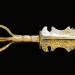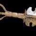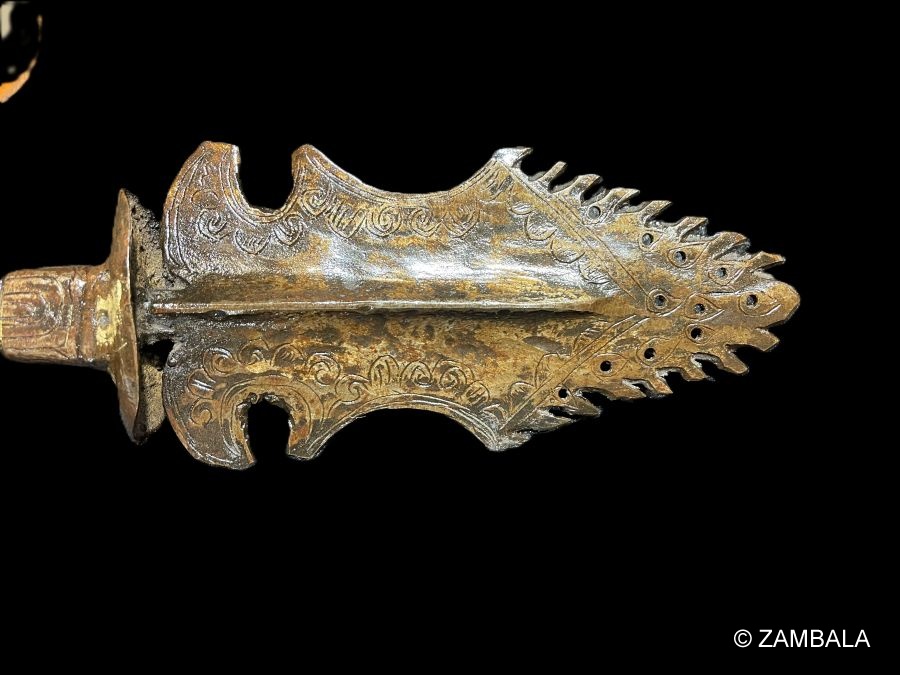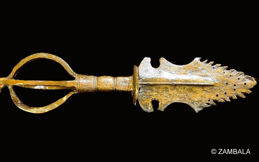 五股文殊智慧劍,又稱文殊智慧劍或文殊降魔劍,是佛教中文殊菩薩的主要法器之一。其特徵是劍身通常以藍色鐵製成,呈雙刃設計,劍身盤繞火焰圖案,劍柄以黃金鍛造,頂端特別飾以半截五股金剛杵(五股象徵五智與五方佛),劍尖周圍放射智慧之火,象徵敏銳的覺識與斷滅愚痴的能力。