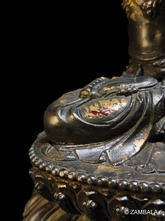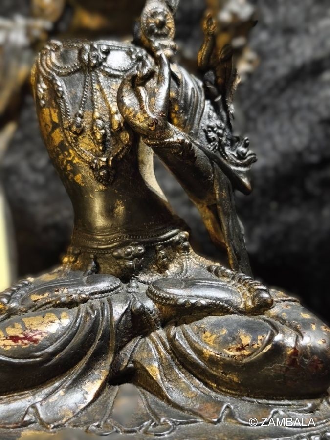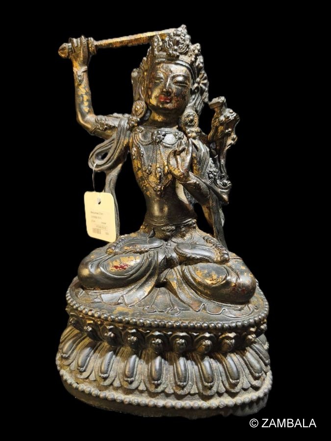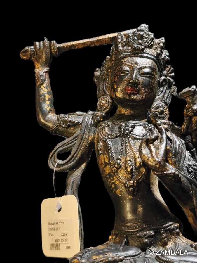 | 材質 : 青銅質 . 鑄模 . 手工製造 . 骨董物件尺寸 : 大約高度 27 cm ( 中型佛像 )敘述 :文殊菩薩(藏語:འཇམ་དཔལ་དབྱངས་,Jampelyang),又稱文殊師利菩薩或妙吉祥菩薩,在藏傳佛教中被尊為智慧的化身,代表般若波羅蜜多(Prajñāpāramitā),即超越智慧。他是藏傳佛教中最重要的菩薩之一,位居菩薩之首,被稱為「法王子」,協助釋迦牟尼佛普度眾生。文殊菩薩不僅象徵智慧、知識和辯才,還被視為冥想本尊(yidam),幫助修行者斬斷無明、煩惱和二元對立,從而獲得覺悟。在藏傳佛教的密宗傳統中,他與觀音菩薩(Avalokiteśvara)和金剛手菩薩(Vajrapāṇi)組成三尊菩薩的三族尊主,共同守護佛法。特別在格魯派(黃教)中,文殊菩薩的憤怒化身如閻魔敵(Yamāntaka,大威德金剛)極為流行,用來降伏死亡和障礙。 文殊菩薩在藏傳佛教中扮演多重角色:- **智慧的守護者和啟發者**:他被認為是所有過去、現在和未來諸佛的「母親」,因為他的智慧引導眾生走向成佛之道。修行者透過文殊菩薩的加持,能提升辯論技巧、記憶力、寫作能力和文學造詣,尤其適合學者和辯經僧侶。- **化身與轉世**:文殊菩薩有無數化身,在藏傳傳統中,一些高僧大德被視為其轉世,例如薩迦派的祖師或某些活佛系統。他也以不同形式顯現,如紅黃文殊(平和形式,強調智慧)、黑文殊(憤怒形式,斬斷障礙)、白文殊(持如意手印,賜予願望)和四臂文殊(多臂象徵多面向智慧)。- **密宗實踐的核心**:在金剛乘(Vajrayana)中,文殊菩薩是重要的本尊,相關經典如《文殊根本續》(Mañjuśrīmūlakalpa)和《文殊師利名誦》(Mañjuśrīnāmasamgīti)被廣泛修持。他的伴侶有時被視為 Saraswati(辯才天女),強調智慧與語言的連結。- **文化與社會影響**:在西藏和尼泊爾等地區,文殊菩薩被奉為守護神,寺廟中常見其像。修行者相信,透過文殊菩薩的修法,能克服愚昧,達成覺醒。 圖像學與象徵在藏傳佛教的唐卡和造像中,文殊菩薩通常被描繪為永遠青春的菩薩形象,頂結五髻或戴五佛冠,象徵佛的五智。他的標準形象包括:- 右手持火焰智慧劍(khadga),象徵斬斷無明和二元妄想。- 左手持蓮花,上置般若經典(Prajñāpāramitā sūtra),代表超越智慧。- 常騎藍色獅子(simha),象徵智慧的勇猛與馴服心靈。其他形式包括:- **六臂文殊**:三頭六臂,持劍、經典、弓箭、花朵等,幫助眾生從六道輪迴中解脫。- **千臂千缽千釋迦文殊**:千手各持缽,每缽中有一尊釋迦牟尼佛,象徵無量佛陀透過般若教化眾生。- **憤怒形式**:如黑文殊或閻魔敵,呈現兇猛相,專門摧毀死亡和業障。 文殊菩薩的神話故事 文殊菩薩的神話故事多源自大乘經典和藏傳傳說,強調他的智慧如何化現、教化和創造。以下是幾個主要故事的詳細敘述: 1. **誕生與吉祥瑞兆**:   根據經典記載,文殊菩薩於古印度舍衛國(Sravasti)誕生,為方便教化眾生而化現菩薩身。誕生時出現十種吉祥瑞兆:房間充滿光明、庭院湧現甘露、地底湧出七寶、神靈開啟寶藏、雞生鳳子、豬生龍豚、馬產麒麟、牛生白澤、倉庫變成金穀、象生六牙象。這些瑞兆象徵他的「妙吉祥」之名,預示他將帶來無量智慧和福祉。此故事強調文殊菩薩的出生即是智慧的顯現,激勵眾生追求覺悟。 2. **斬斷無明與教化弟子**:   文殊菩薩被稱為「諸佛之師」或「佛母」,因為他曾為七佛之師,指導無數弟子成佛。例如,在《華嚴經》中,他啟發善財童子(Sudhana)向南方參訪五十三位善知識,學習菩薩道。另一著名故事是教化八歲龍女:在《妙法蓮華經》中,文殊菩薩向舍利弗解釋龍女如何透過智慧瞬間成佛,打破性別和年齡的偏見,證明智慧超越一切障礙。此外,他領導阿難尊者在鐵圍山結集大乘經藏,確保佛法傳承。 3. **尼泊爾谷地的創造傳說**:   一個與藏傳佛教密切相關的傳說發生在尼泊爾加德滿都谷地(Kathmandu Valley)。據說谷地原本是一片大湖,充滿水患和毒蛇。文殊菩薩從中國五臺山(Wutai Shan,他的駐錫地)前來,用智慧之劍斬開山脈(Chobhar Gorge),排水形成谷地,讓土地適合居住。他率領弟子移山填沼,建造城市,迎接釋迦牟尼佛降臨。此故事象徵文殊菩薩的智慧如何轉化混亂為秩序,創造適合修行和文明的環境。在藏傳和尼泊爾佛教中,這被視為文殊菩薩的慈悲化現,至今谷地內有許多奉獻給他的寺廟,如Swayambhunath(猴廟),據說是文殊菩薩的聖地。 4. **過去與未來成佛**:   文殊菩薩本為古佛,曾在無量劫前成佛,為「大身如來」(平等世界)、「龍種上如來」(空寂世界),現為「歡喜藏摩尼寶積如來」。未來,他將在無垢世界成佛,號「普現如來」。這些故事強調文殊菩薩的永恆存在和無盡慈悲,為眾生示現菩薩道而非立即入涅槃。 這些故事不僅突顯文殊菩薩的智慧力量,還鼓勵修行者透過修持他的咒語(如「嗡 阿 惹 巴 札 那 諦」,oṃ a ra pa ca na dhīḥ)來獲得加持。總體而言,文殊菩薩在藏傳佛教中是智慧的燈塔,透過神話傳達覺醒的深刻教義。    |  |