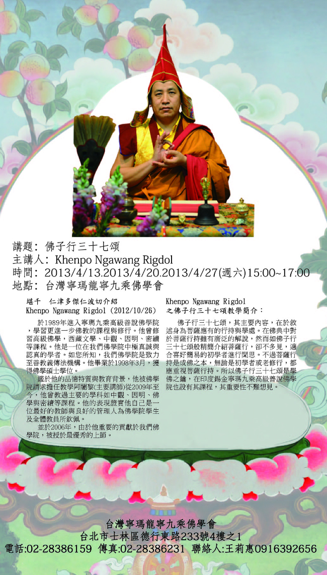 我們亦邀請畢業於瓦拉那西Sanskrit大學的索南老師為堪布大悲講學翻譯。 法喜充滿!! 台灣寧瑪龍寧九乘佛學會 敬邀