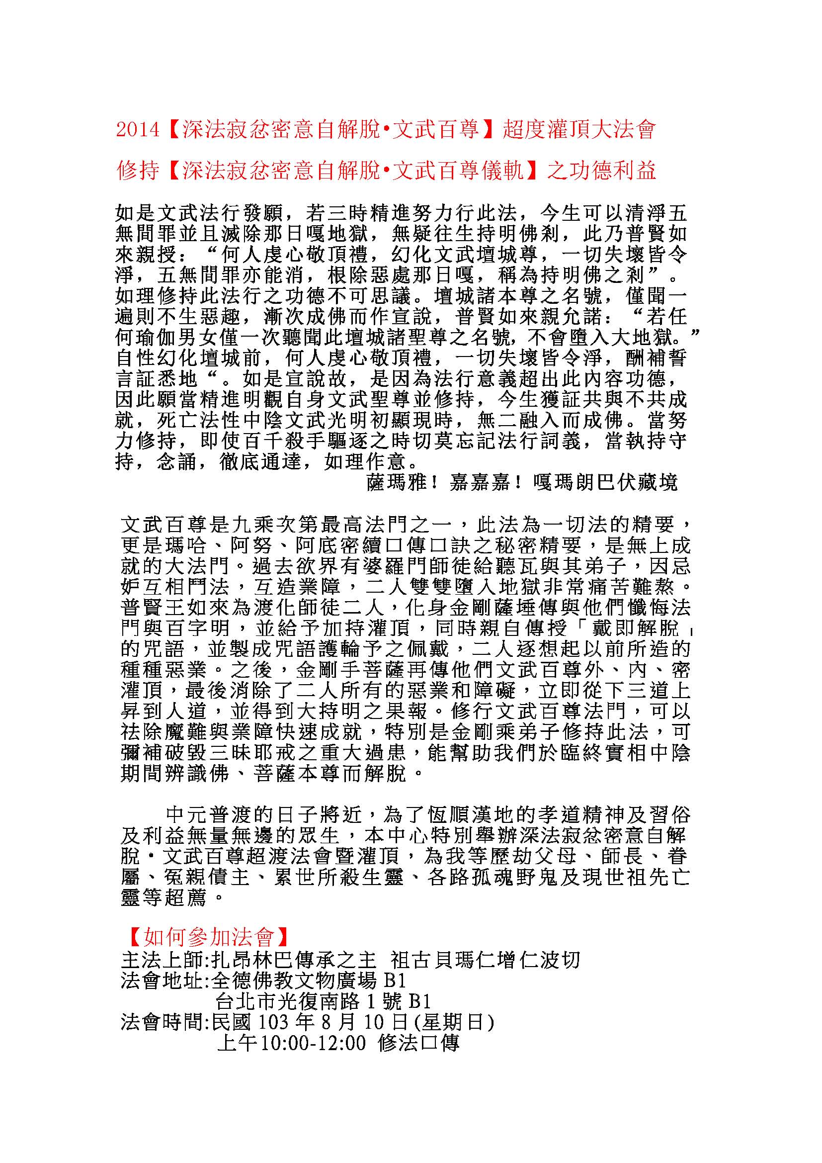 | 虛空法林2014【深法寂忿密意自解脫‧文武百尊】灌頂超度大法會 |