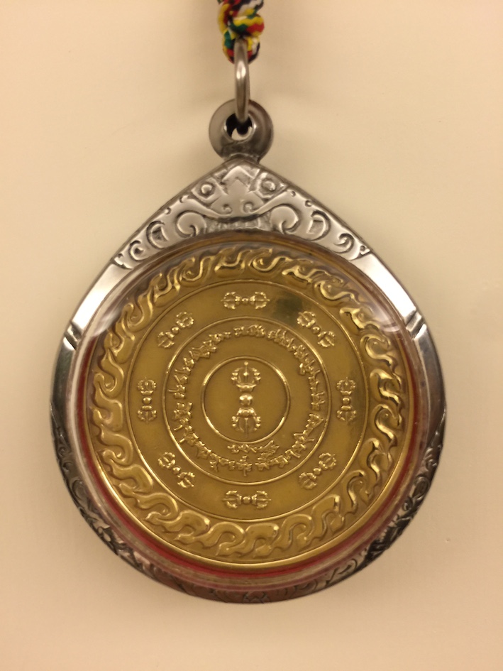 為利益眾生故,虛空法林佛學會住持 貝瑪仁增仁波切 妥善修製出自大寶伏藏大圓滿繫解脫與防護一切病魔障礙之金剛鎧甲護輪。(護輪乃雙面,一面是繫解脫密續另一面是金剛鎧甲)於 措尼仁波切傳授大圓滿覺性力灌頂暨繫解脫之灌頂時加持之。