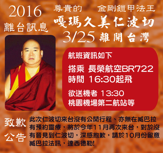 | 尊貴的 嘎瑪久美仁波切 離台資訊 |