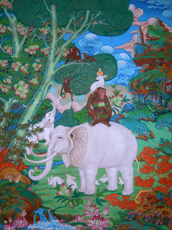 其他三位伙伴一起說道:“我們當中數你的年歲最長,大家理所當然,應該對你恭敬,聽你的話。”說完,猴子首先對山兔、羊角鳥禮敬一番,接著,山兔對羊角鳥恭敬頂禮,最後,大象對所有的同伴都恭敬頂禮。