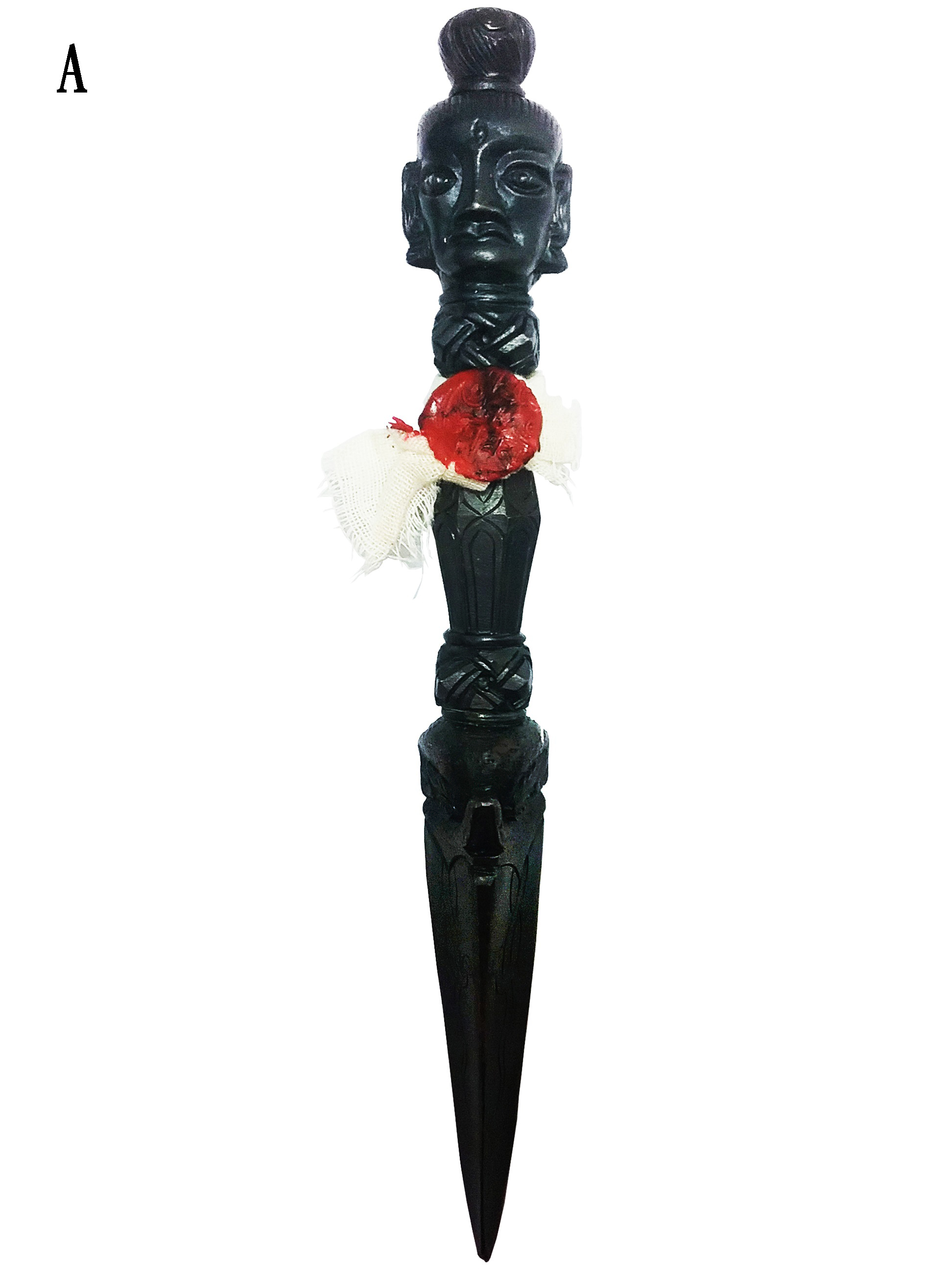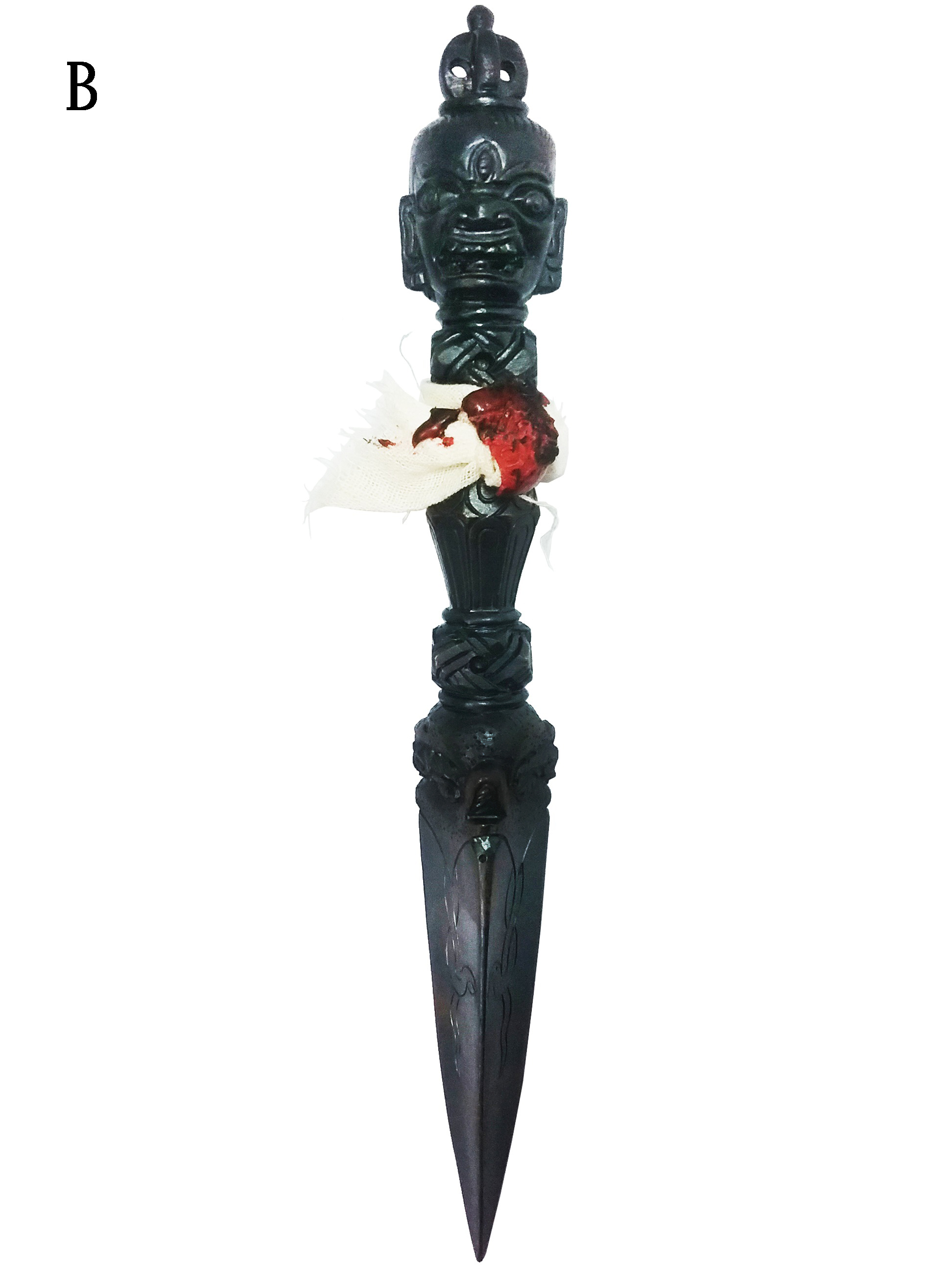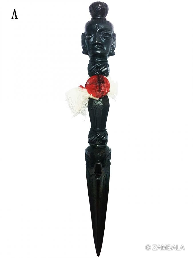 金剛橛原是古印度人破甲用的冷兵器,後來被藏傳佛教吸收為法器,有銅、銀、木、等各種材料製成,外形上大同小異,都是有一尖刃頭,但手把上因用途不同而裝飾不同。有的手柄是佛頭;也有的是觀音菩薩像,頭戴五骼髏冠,最上端又有馬頭。它含有忿怒,降伏的意思。修法時在壇場的四角樹立,意思是使道場範圍內堅固如金剛,各種魔障不能來危害。