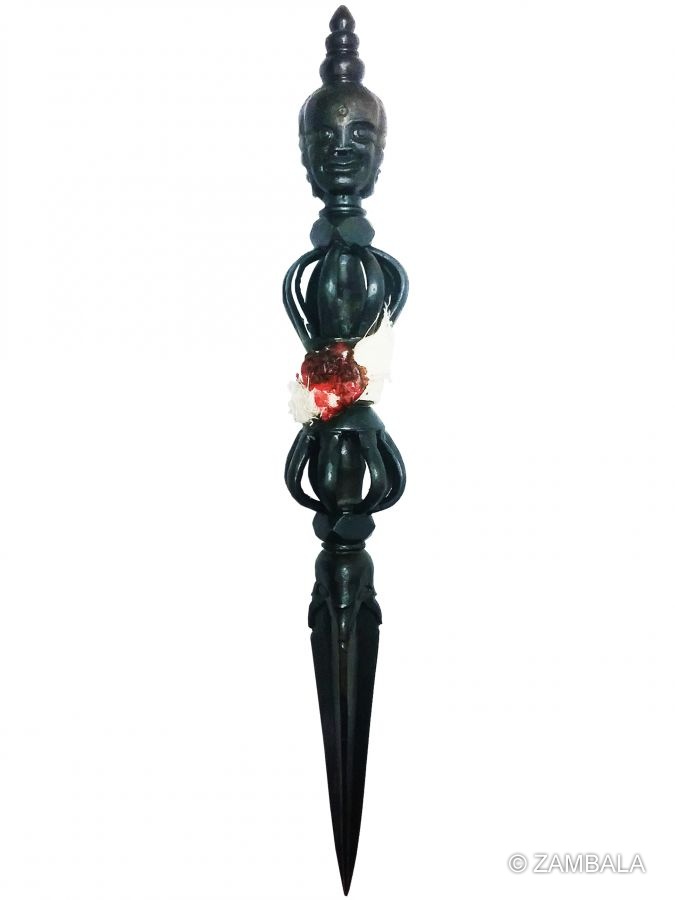 金剛橛原是古印度人破甲用的冷兵器,後來被藏傳佛教吸收為法器,有銅、銀、木、等各種材料製成,外形上大同小異,都是有一尖刃頭,但手把上因用途不同而裝飾不同。有的手柄是佛頭;也有的是觀音菩薩像,頭戴五骼髏冠,最上端又有馬頭。它含有忿怒,降伏的意思。修法時在壇場的四角樹立,意思是使道場範圍內堅固如金剛,各種魔障不能來危害。