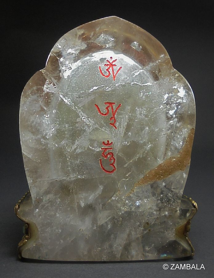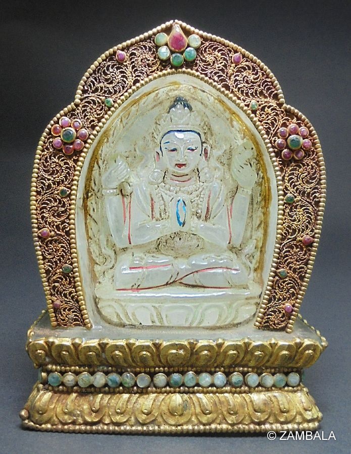 四臂觀音是佛菩薩之菩提心所化現﹐是很久以前已成正等正覺之古佛﹐稱為「正法明如來」﹐為救度不同眾生而示現不同的相﹐世人稱為大慈大悲的觀世音菩薩﹐與娑婆世界之眾生特別有緣﹐因為他經常示現救度眾生﹐因此觀世音菩薩最為受人供奉。四臂觀音的報身相中﹕白色身代表清淨無暇﹐四臂代表四種佛行﹐即「息」、「增」、「懷」、「誅」等。「息」是平息所有的痛苦、障礙及困難。「增」是增加福報、智慧、長壽、財富等。「懷」是救度眾生、領導他們修行。「誅」是誅滅眾生種種惡念、克服外界魔障等。四臂的手﹐前兩隻合十胸前﹐抱著一顆如意寶珠﹐代表能滿足所有眾生的要求。另外的兩隻是﹕右手持一串水晶念珠﹐代表不停地救度眾生。左手持一朵蓮花﹐代表清淨的心﹐沒有暇疵。觀世音的左邊肩膀披上一塊鹿皮﹐是代表慈悲及純正的心﹐而頭頂上戴著的五方佛冠是代表五方的智慧﹐其它所穿著的綢緞及瓔珞都是代表莊嚴的報身相﹐而雙腿雙盤的金剛坐姿是代表穩固禪定的境界。總括以上六種裝飾代表六度萬行的成就。坐在月盤上代表慈悲方便的法﹐月盤下之蓮花﹐代表清淨的境界。