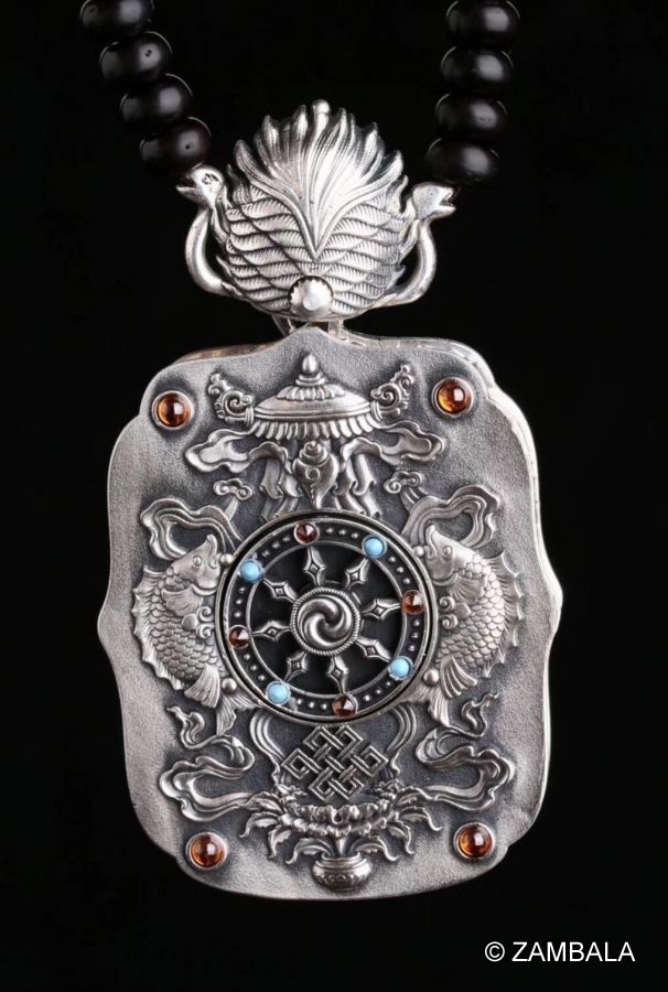 文殊菩薩/八吉祥總集 精雕純銀鍍金鑲寶石佛牌