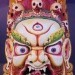 瑪哈嘎拉是藏傳佛教中的重要護法神,屬於「忿怒尊」(wrathful deity),其面具以兇猛、威嚴的形象呈現,象徵摧毀無明、煩惱與魔障的力量。他的形象通常帶有多頭、多臂、火焰環繞,展現強大的威力和保護力,守護佛法與修行者。