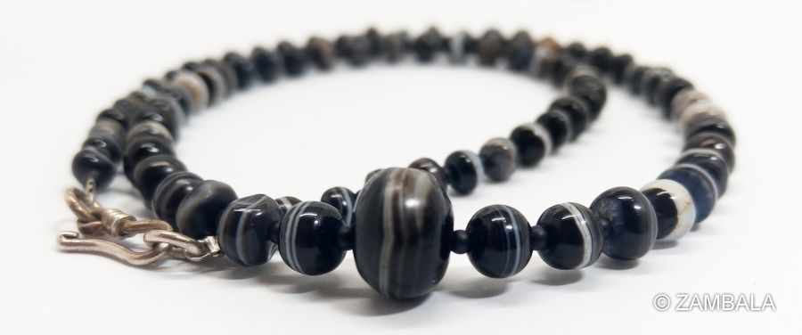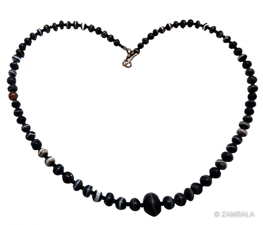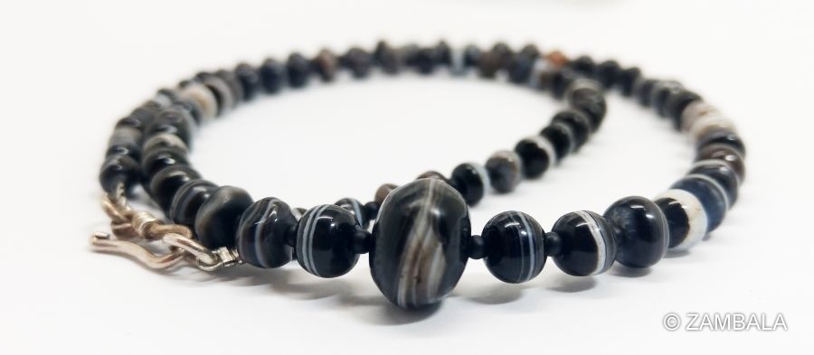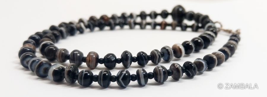 1. **傳說與藥師佛的關聯**:據藏傳佛教傳說,藥師佛手持此珠作為念珠,珠子上的一條白線象徵佛眼,能庇佑眾生免除病痛與災厄。早期西藏藥師(藏醫師)外出為病患診治時,會佩戴白線條黑瑪瑙串成的藥師珠,將其磨成粉末入藥治療,故得名「藥師珠」。這反映了其在藏醫學中的實用價值,上乘品質的藥師珠甚至可直接入藥。