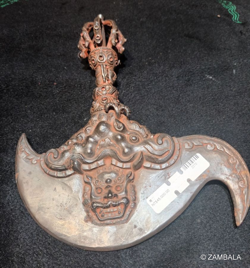 是藏傳佛教常見的法器,代表神聖佛法不容侵犯,衛護佛法之心,如藏傳佛教的虎面空行母、獅面空行母、大威德金剛、瑪哈嘎拉的造像都有手臂持鉞刀。